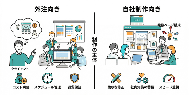 LP制作の費用を検討する前に、「そもそも外注すべきか、自社で対応すべきか」を判断することが大切です。判断を誤ると、費用の無駄遣いや機会損失につながります。