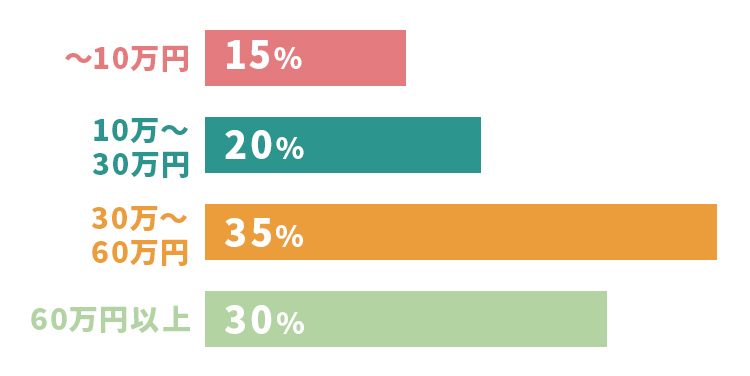 業界の調査データを総合すると、LP制作の平均発注金額は約55万円、中央値は約40万円です。全体の約7割が60万円以下の予算でLPを制作しており、最もボリュームが多い価格帯は30万〜60万円となっています。