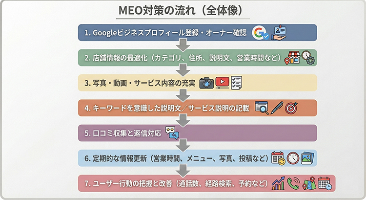 SEOよりも成果が出やすいMEOですが、具体的にどのような対策を行うのでしょうか。